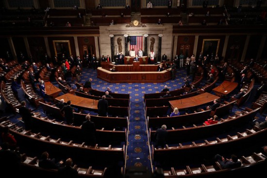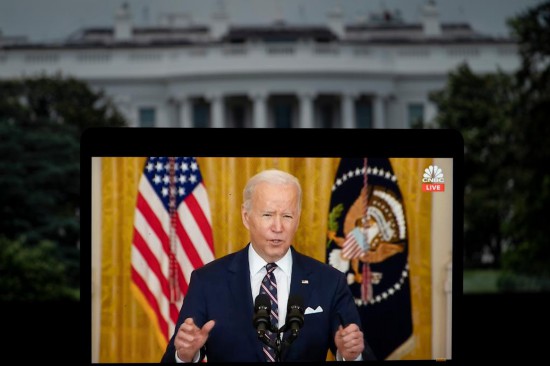 2021年4月28日,美国总统拜登在首都华盛顿发表上任以来对国会参众两院的首次演说。(新华社发,奇普·索莫德维利亚摄)
