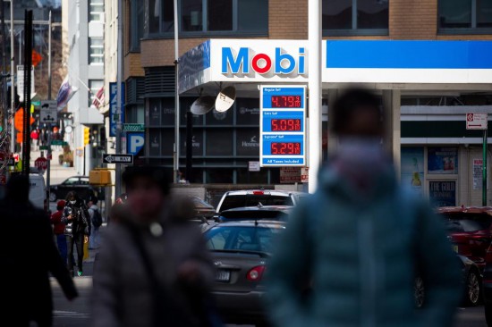 2月10日,美国纽约一家加油站电子屏显示油品价格。美国劳工部当日公布数据显示,今年1月美国消费者价格指数环比上涨0.6%,同比上涨7.5%,创1982年2月以来最大同比涨幅,美国通货膨胀压力继续攀升。(新华社发,郭克摄)