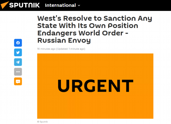 俄罗斯卫星通讯社刚刚消息,俄罗斯驻日本大使米哈伊尔·加卢津称,美国及其西方盟友制裁任何有自己立场国家的行为,对世界秩序构成了威胁。