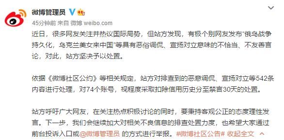 荔枝新闻讯 @微博管理员 2月25日发布消息:近日,很多网友关注并热议国际局势,但站方发现,有极个别网友发布“俄乌战争持久化,乌克兰美女来中国”等具有恶俗调侃、宣扬对立意味的不恰当、不友善言论,对此,站方坚决予以处置。