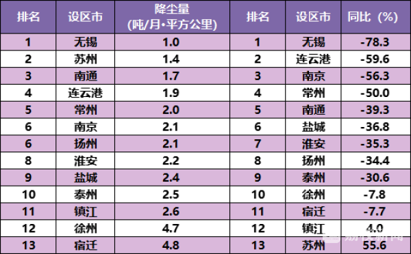 为进一步推进全省环境空气质量改善,按期保质完成年度大气污染防治攻坚目标任务,江苏省生态环境厅今天(2月25日)发布了今年1月13个设区市降尘量进行排名。