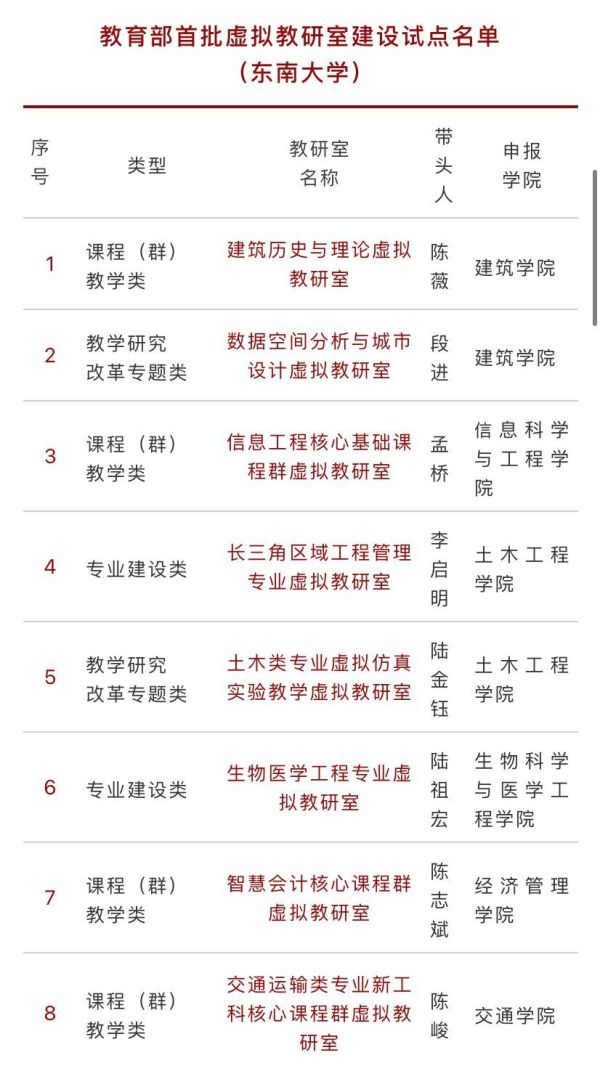 近日,教育部办公厅发文公布了全国首批虚拟教研室建设试点名单,东南大学牵头的10个虚拟教研室获批入选,数量并列全国第三、全省第一。