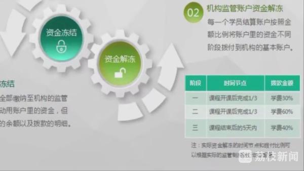 这个“校外培训机构预付费监管平台”由扬州市教育部门打造。扬州市面向中小学生的校外培训机构都需在平台注册登录,与银行签订协议。今后,家长的学费将直接进入设于中国银行的专用监管账户。随着课时进行分批释放至培训机构。