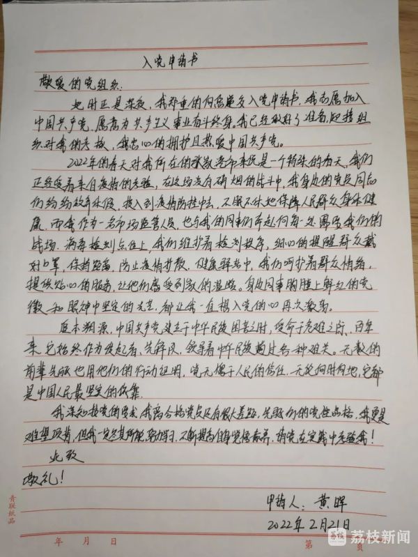 “此时正是深夜,这是我的入党申请书,作为一名‘90后’,在这个特殊的时期,我志愿加入中国共产党,请党组织在实践中考验我。”2022年2月21日晚上,黄晖郑重地向机关第二支部递交了入党申请书。连日来,他24小时待命,持续坚守在抗疫一线,在核酸检测点位上,一遍遍测温查码、一次次温馨提醒,维护现场秩序,为疫情防控贡献一份力量。
