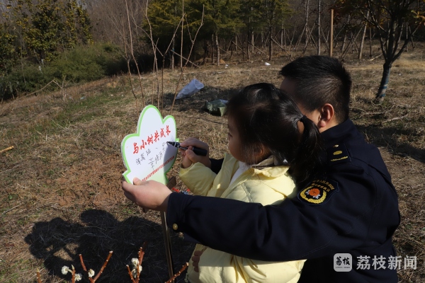 垃圾捡拾完毕后,第五支部全体党员带领孩子们在园内种下了四棵树,孩子们在“与小树共成长”的铭牌上签名留念。