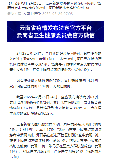 截至2022年2月25日24时,云南省现有确诊病例63例,累计治愈出院病例1872例,累计死亡病例2例,累计报告确诊病例1937例。累计追踪到密切接触者39769人,尚在医学观察的密切接触者1652人。