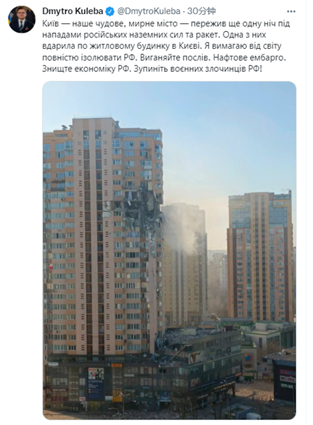 乌克兰外交部长也发推晒出同一栋受损建筑,指责俄地面部队和导弹的袭击。
