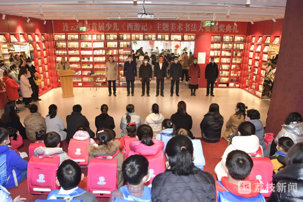 “你看这是我的获奖作品,我画的是西游记的《美猴王》,得了三等奖!”张荠心小朋友站在自己的作品面前兴奋地说。2月26日,在连云港海州区举办了连云港市首届儿童《西游记》主题美术书法大赛颁奖仪式,此次活动是由海州区教育局、海州区文化体育和旅游局、江苏海州文旅集团主办,全民阅读时畔书房承办。90位获奖同学、18位获奖优秀教师到场接受颁奖。