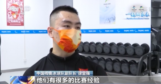 中国残奥冰球队副队长 徐金强:他们建队的时间比我们要长,他们有很多的比赛经验,但是我们的团队的优势在于我们队员之间默契程度都是非常的高,在我们自己家门口比赛也是非常高兴,也是非常激动的,不管面对哪个队伍,我们都是拼搏到底,我们背后有一个强大的祖国,还有我们的家人给我们在我们背后做坚强的护盾。