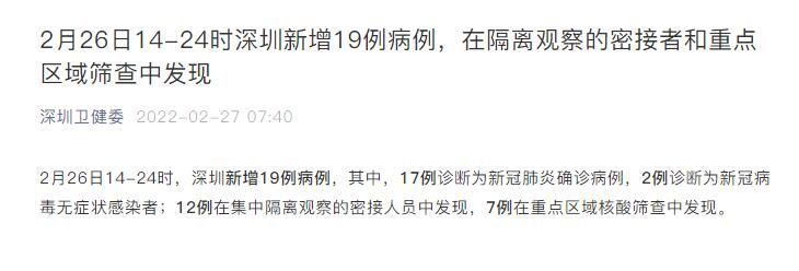 荔枝新闻讯 据深圳卫健委消息,2月26日14-24时,深圳新增19例病例,其中,17例诊断为新冠肺炎确诊病例,2例诊断为新冠病毒无症状感染者;12例在集中隔离观察的密接人员中发现,7例在重点区域核酸筛查中发现。