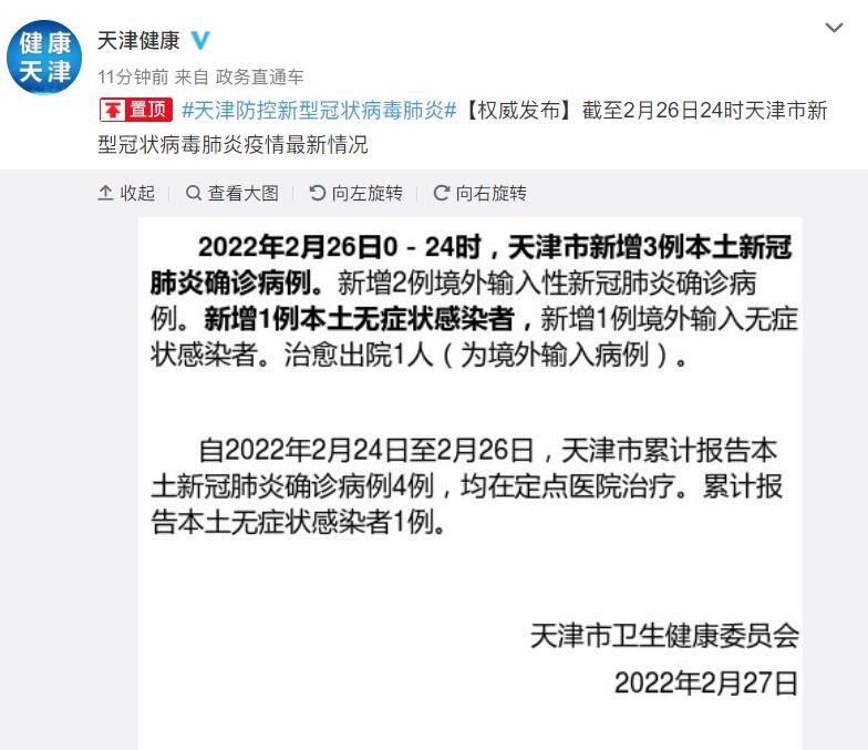 荔枝新闻讯 据@天津健康 消息,2022年2月26日0—24时,天津市新增3例本土新冠肺炎确诊病例。新增2例境外输入性新冠肺炎确诊病例。新增1例本土无症状感染者,新增1例境外输入无症状感染者。治愈出院1人(为境外输入病例)。