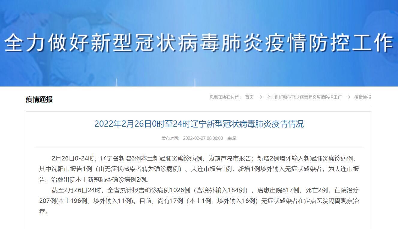 截至2月26日24时,辽宁省累计报告确诊病例1026例(含境外输入184例),治愈出院817例,死亡2例,在院治疗207例(本土196例、境外输入11例)。目前,尚有17例(本土1例、境外输入16例)无症状感染者在定点医院隔离观察治疗。