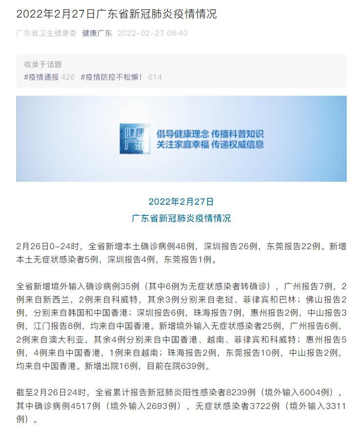 广东省新增境外输入确诊病例35例(其中6例为无症状感染者转确诊),广州报告7例,2例来自新西兰,2例来自科威特,其余3例分别来自老挝、菲律宾和巴林;佛山报告2例,分别来自韩国和中国香港;深圳报告6例,珠海报告7例,惠州报告2例,中山报告3例,江门报告8例,均来自中国香港。新增境外输入无症状感染者25例,广州报告6例,2例来自澳大利亚,其余4例分别来自中国香港、越南、菲律宾和科威特;惠州报告5例,4例来自中国香港,1例来自越南;珠海报告2例,东莞报告10例,中山报告2例,均来自中国香港。新增出院16例,目前在院639例。