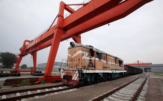 2月21日13:00,一辆满载34车厢钢材的火车沿着铁路专用线驶入金驹物流园内,在火车徐徐停稳后,工作人员将三台龙门吊同时启动,进行货物的卸载。