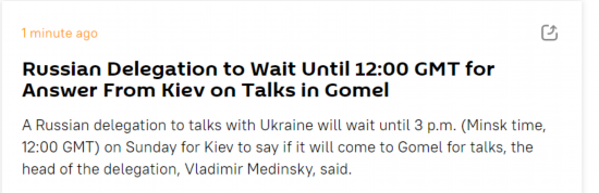 此前,多家俄媒消息称,据俄总统新闻秘书佩斯科夫介绍,俄方代表团已抵达白俄罗斯,准备与乌方会谈。佩斯科夫说,俄方人员包括外交部、国防部和总统行政部门等机构代表, “现在正在等待乌克兰人”,“我们将准备在戈梅利开始谈判”。