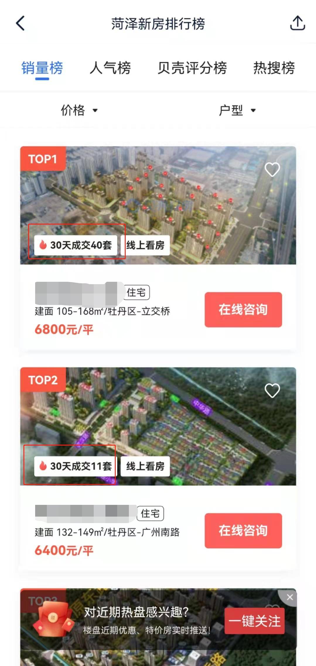 红星资本局通过贝壳找房APP发现,目前菏泽市在售的新住宅楼盘共有114个。其中,登上销量榜第一名的某楼盘,在30天内成交了40套房。