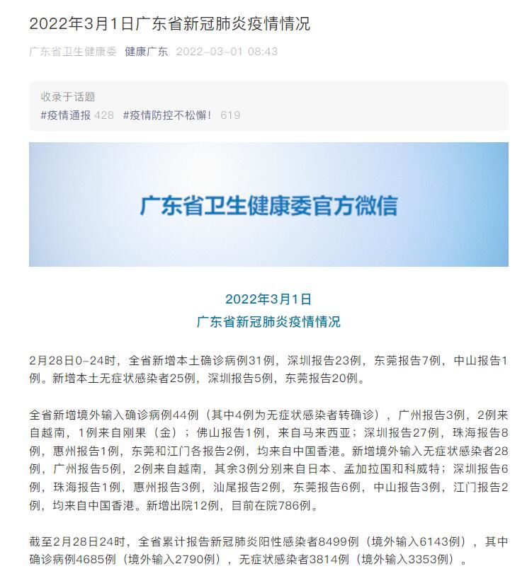 荔枝新闻讯 2月28日0—24时,广东省新增本土确诊病例31例,深圳报告23例,东莞报告7例,中山报告1例。新增本土无症状感染者25例,深圳报告5例,东莞报告20例。
