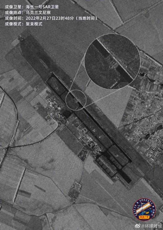 位于乌克兰中西部的文尼察市为乌克兰空军司令部所在地,据外媒报道,该地多处近日发生猛烈交火,有军事设施遭到破坏。2月28日,《环球时报》记者从商业卫星公司天仪研究院处获悉,由天仪研究院“海丝一号”SAR遥感卫星于当地时间27日晚获取的一张卫星图像显示,目前文尼察空军基地的跑道遭受火力打击。