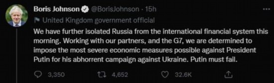“今天上午,我们进一步将俄罗斯从国际金融体系中孤立出去。我们决心与我们的伙伴、和七国集团合作,对总统普京实施可能最严厉的经济(制裁)措施,以应对他对乌克兰令人憎恶的所作所为。普京必须失败。”约翰逊写道。