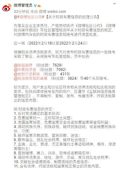 荔枝新闻讯 据@微博管理员 3月1日消息,为落实企业主体责任,严格贯彻执行《微博社区公约》《微博投诉操作细则》等社区管理规则中关于时政有害信息的规定,对微博内存在的时政有害信息和账号进行清查处置。