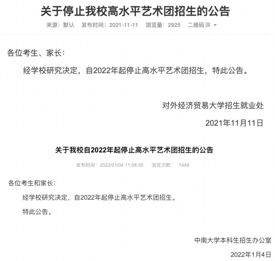 近期,中南大学、对外经济贸易大学发布通知,宣布2022年开始不再进行高水平艺术团招生,引发考生和家长高度关注。