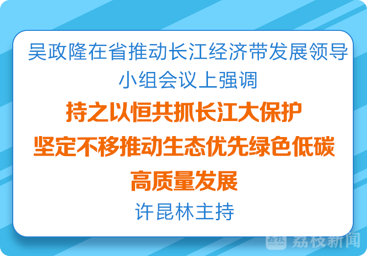 荔枝新闻讯 3月1日,省推动长江经济带发展领导小组会议召开。省委书记、省推动长江经济带发展领导小组第一组长吴政隆强调,要坚持以习近平新时代中国特色社会主义思想为指导,深入学习贯彻习近平总书记关于推动长江经济带发展的重要讲话重要指示精神,认真落实党中央、国务院决策部署,坚持问题导向、目标导向、结果导向相结合,持之以恒共抓大保护、不搞大开发,坚定不移推动长江经济带江苏段生态优先绿色低碳高质量发展,坚决扛起“争当表率、争做示范、走在前列”光荣使命,奋力谱写“强富美高”新江苏现代化建设新篇章。省长、省推动长江经济带发展领导小组组长许昆林主持会议。