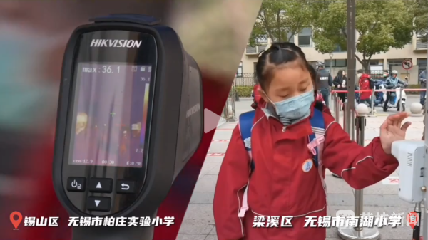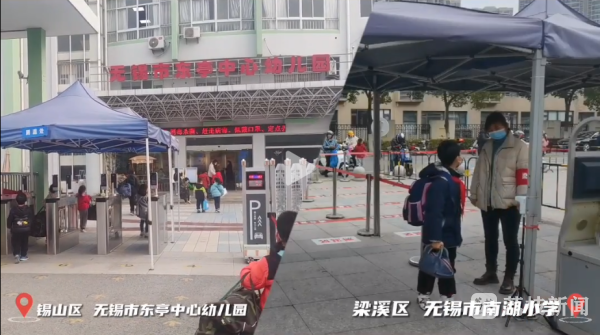 2月28日,无锡市梁溪、锡山区域内幼儿园、小学、初中开始返校复课。学生们经过体温测量,有序进入校园。