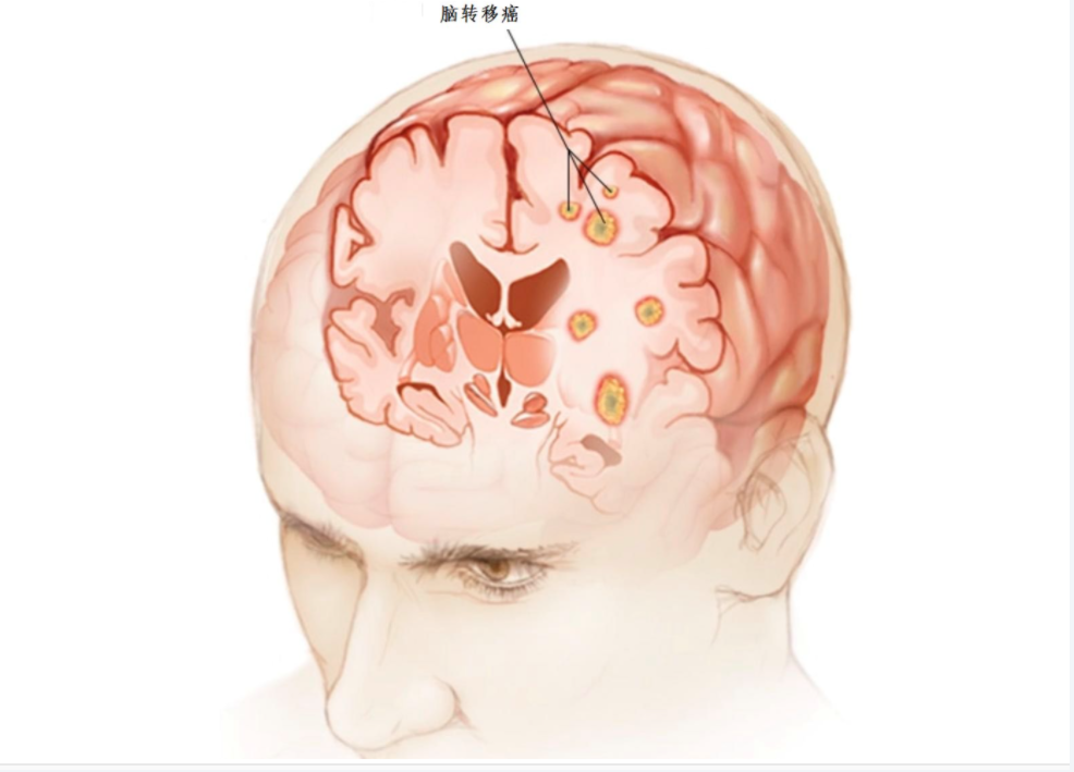脑转移瘤是指原发于其他部位的肿瘤细胞转移入脑内,其发病率占脑胶质瘤的5倍,以肺癌脑转移最多见,其次是乳腺癌、黑色素瘤。发病年龄高峰40~60岁,男性多于女性。常表现为颅内压增高,病人表现头痛、恶心及呕吐等;依肿瘤部位不同,也可以出现精神症状、失语、癫痫、肢体运动及感觉障碍等。