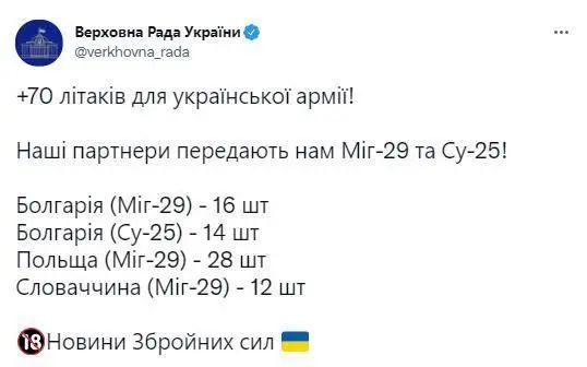 28日晚上,美国政治新闻网(Politico)援引未具名的乌克兰政府官员的话称,乌克兰飞行员已抵达波兰准备接收这些战机。该网站还指出,乌克兰议会官方推特账号也发布了有关来自波兰、斯洛伐克和保加利亚的70架战机即将送达的消息,包括波兰28架米格-29战机,斯洛伐克12架米格-29战机,保加利亚16架米格-29以及14架苏-25战机。