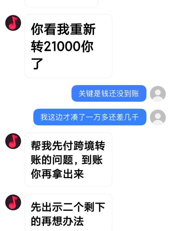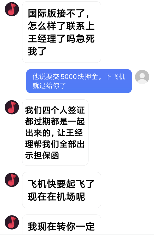 小张再次联系了“王经理”,王经理称要交20000元押金(5000元/人),下了飞机就能退还,在张先生向“好友”说明了情况后,没过几分钟“好友”又发来一张截图,表示已经向小张账户汇款21000元,让他继续帮忙在国内代付。