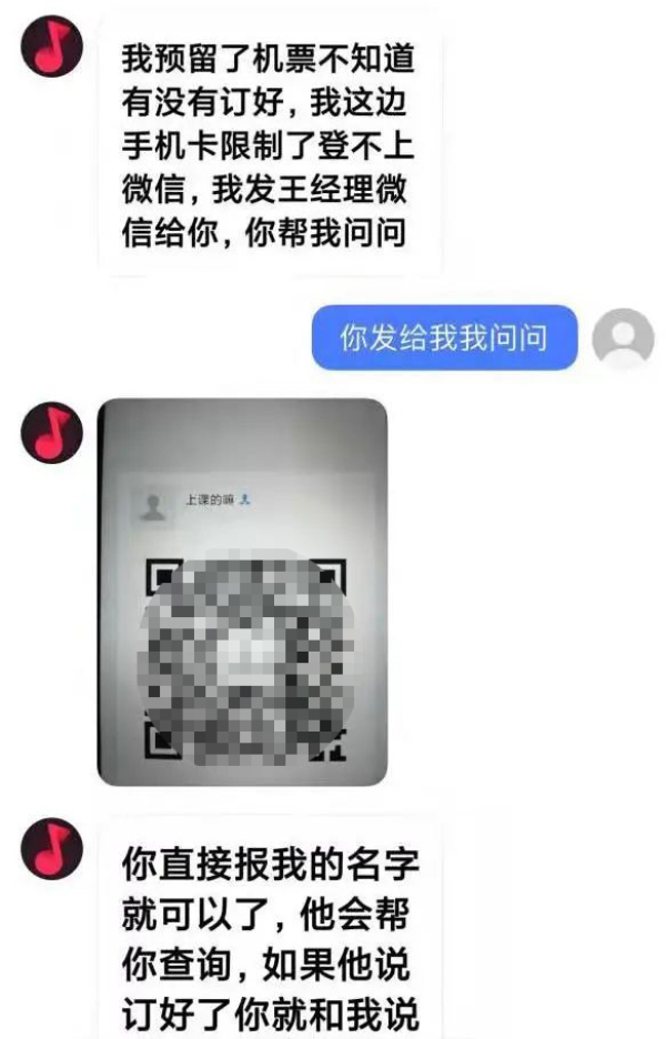 小张收到好友的这一条“暖心” 的信息后,瞬间拉近了两人的距离,昔日的回忆涌上心头,即使多年不联系、回国还想着自己,小张觉得这就是“老铁”。没聊多久,“好友”就告诉小张,自己的预留的机票出现了问题,由于手机卡被限制了,无法登录微信、接打电话,请求小张帮忙联系一下机场客服王经理。