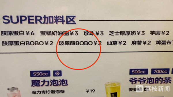 近期,奶茶届刮起了玻尿酸风,出现了众多以玻尿酸为卖点的奶茶。在南京某奶茶店,记者买到了含有玻尿酸小料的奶茶,但店员坦白用处不大。除了奶茶,玻尿酸威士忌、玻尿酸饮料和口服玻尿酸补品也多了起来。