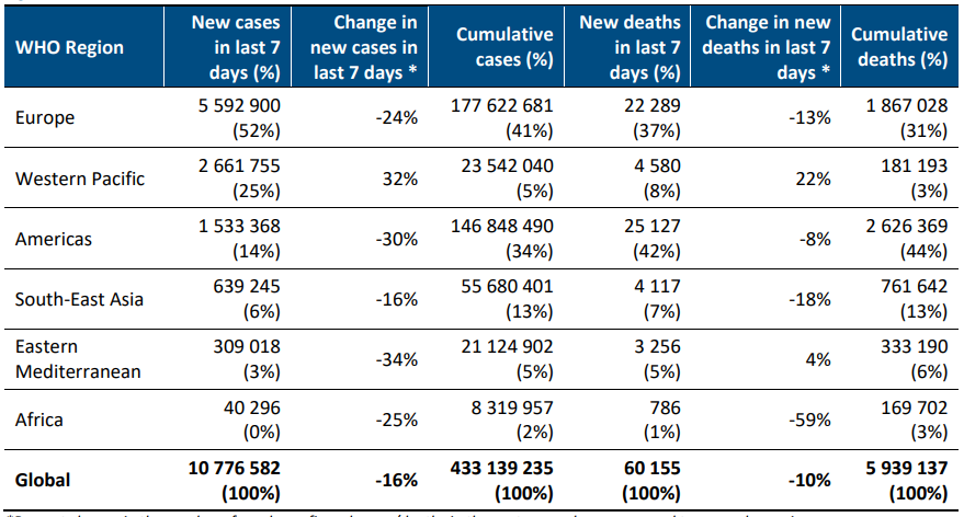 报告指出,2月21日至2月27日期间,全球新增新冠肺炎确诊病例超过1000万例,较前一周减少16%,新增死亡病例数同样呈现下降趋势,降幅为10%。除西太平洋区域新增确诊病例增加32%,其他各区域新增确诊病例均有所减少,其中东地中海区域降幅最大,新增确诊病例较前一周减少34%,其次是美洲区域和非洲区域。