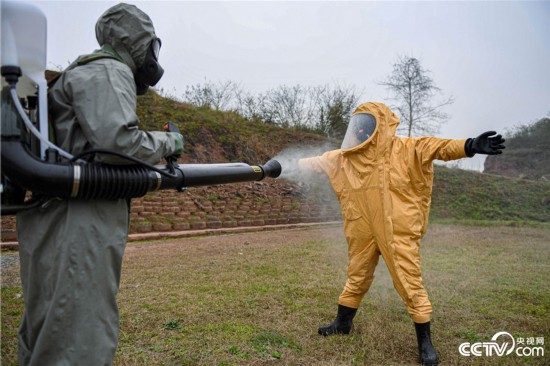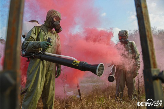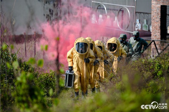 官兵对染毒区域进行洗