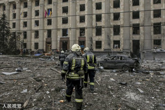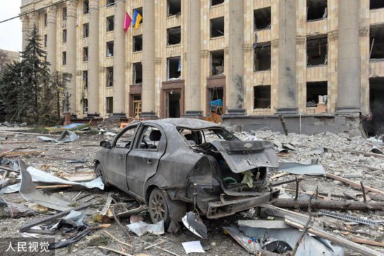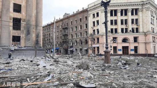 当地时间2022年3月1日,乌克兰哈尔科夫市中心的政府大楼广场遭到炮击。