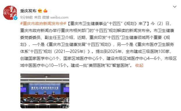 重庆市卫生健康委党委委员、副主任王卫介绍,近期,重庆印发“十四五”卫生健康领域两个重要《规划》,一个是《重庆市卫生健康发展“十四五”规划》,另一个是《重庆市医疗卫生服务体系“十四五”规划(2021—2025年)》。提出到2025年,全市建成三级医院100家,创建国家医学中心1个,国家区域医疗中心5个,建设市级区域医疗中心4—6个、市级区域中医医疗中心10—15个。建成一批“美丽医院”和“智慧医院”。
