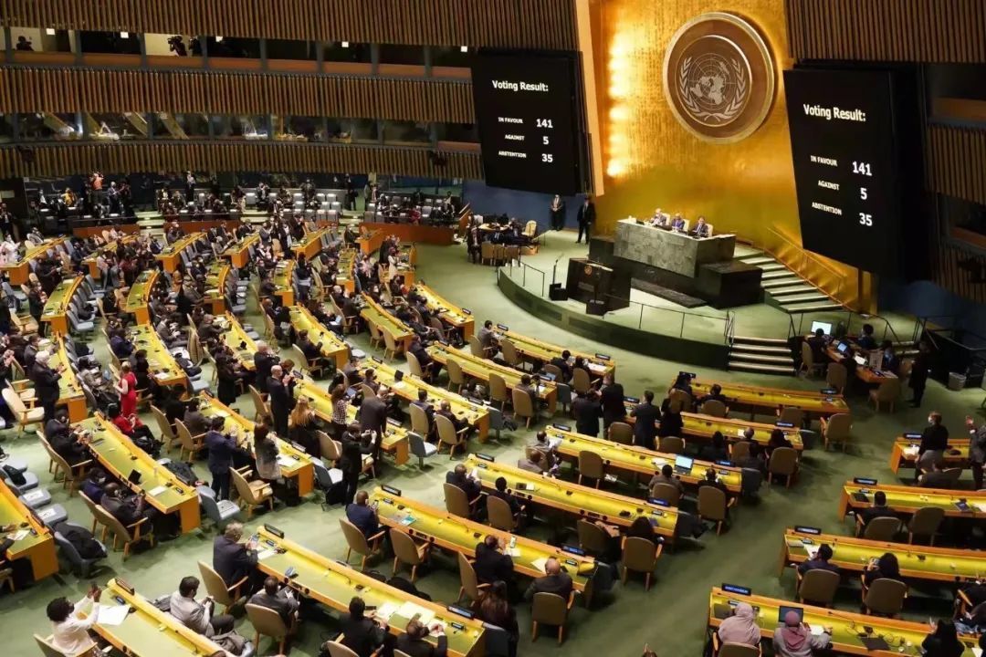 当地时间3月2日,联合国大会第11次紧急特别会议成员进行投票表决,通过了由乌克兰等超过90国共同提交的乌克兰局势决议草案。此次投票中141票赞成、5票反对、35票弃权。由于赞成票超过有效票三分之二,因此决议草案通过。俄罗斯、叙利亚、白俄罗斯、朝鲜、厄立特里亚投票反对,中国投票弃权。