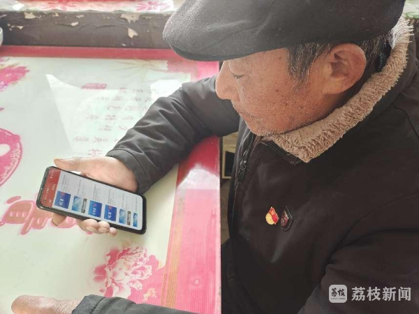老党员陈文虎用手机进行射阳党建app 冬训云打卡
