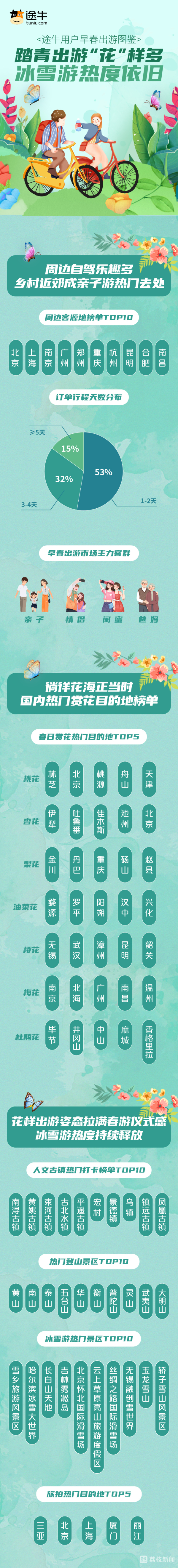 万物复苏,春和景明,眼下正是领略早春风光的好时机。从途牛旅游网春游产品的预订情况看,超七成游客选择以一场短途周边游开启与春天的美好约会。其中,来自北京、上海、南京、广州、郑州、重庆、杭州、昆明、合肥、南昌等地的游客出游热情最为高涨。