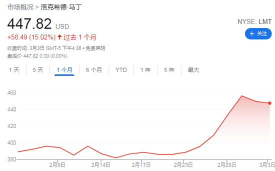 在今年2月初,美国政府高层官员开始不断煽动俄乌紧张局势之际,美国军工股股价已经悄然开启涨势。在2月24日俄乌战争正式打响之后,美国军工股开始大幅飙升。2月25日至3月1日的三个交易日内,洛克希德-马丁公司股价上涨超16%,诺思罗普-格鲁曼公司上涨超15%,雷神公司上涨超10%。