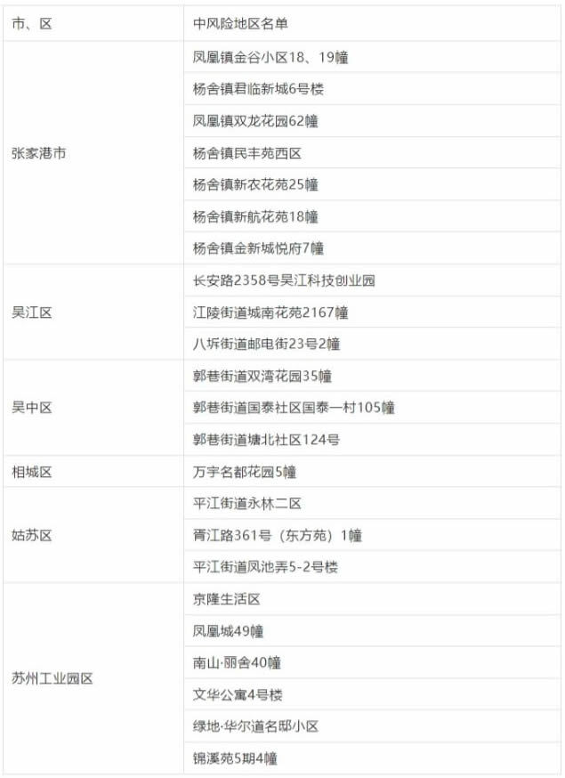 吴中区郭巷街道建发独墅湾82幢、相城区北桥街道盛北花园45幢、相城区北桥街道漕韵家园28幢、苏州工业园区明日之星1幢、苏州工业园区星胜客11幢由中风险地区调整为低风险地区。