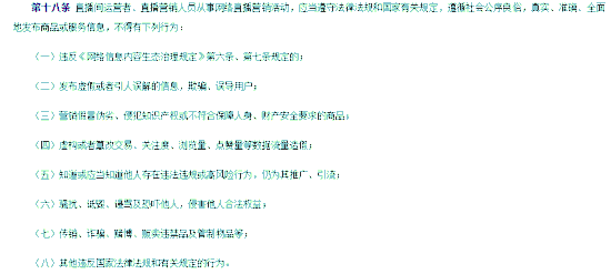 其中,第三章关于直播间运营者和直播营销人员的规定中,第十八条明确:直播间运营者、直播营销人员从事网络直播营销活动,应当遵守法律法规和国家有关规定,遵循社会公序良俗,真实、准确、全面地发布商品或服务信息。