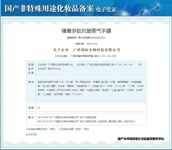 据《消费者报道》了解,这款臻羞多肽抗皱蒸汽手膜是由广州国妆生物技术有限公司生产,该公司成立于2019年7月23日,经营范围包括化学工程研究服务,化妆品及卫生用品批发、零售等。资料显示,该公司同时生产臻羞烟酰胺手膜多款手膜、臻羞牛初乳丝滑滋润手足膜等多款护理产品,唯独这款臻羞多肽抗皱蒸汽手膜遭投诉最多。