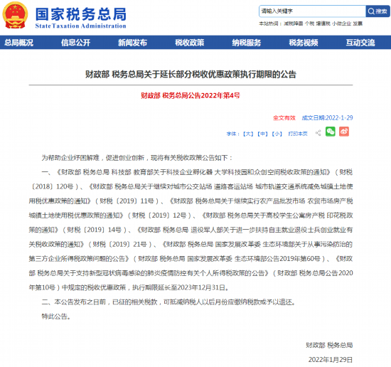 财政部、税务总局1月29日联合发布《关于延长部分税收优惠政策执行期限的公告》(2022年第4号)