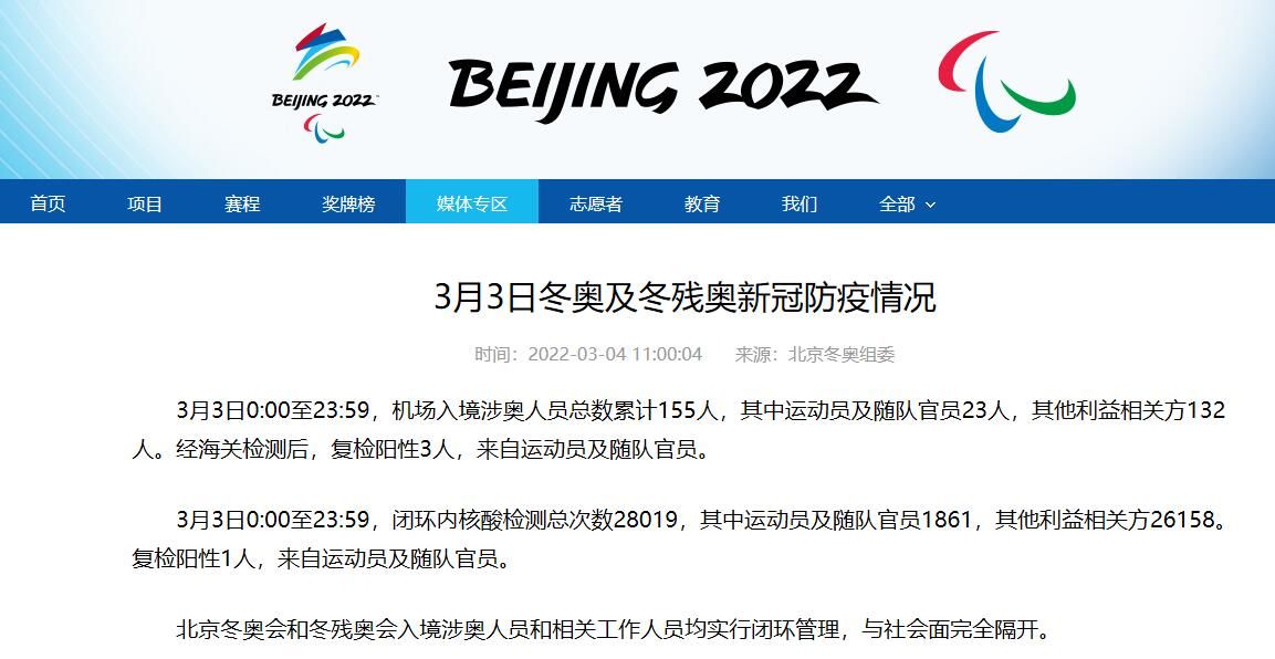 3月3日0:00至23:59,闭环内核酸检测总次数28019,其中运动员及随队官员1861,其他利益相关方26158。复检阳性1人,来自运动员及随队官员。