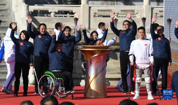 3月2日,残疾人运动员、残联等各界人士代表在北京冬残奥会火种汇集仪式上手持采火棒登上主席台,用取自九个点位的火种共同点燃仪式火种台。新华社记者陶希夷摄