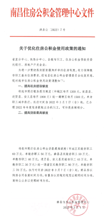具体而言,提高租房提取额度方面,将南昌市现行租房提取额度(市城区每月1200元,南昌县、进贤县、安义县每月1000元)统一调增至每月1500元,单身职工减半执行。执行时间自2022年3月7日(含)起,已办理2022年年度租房提取业务的职工,可补提差额部分。