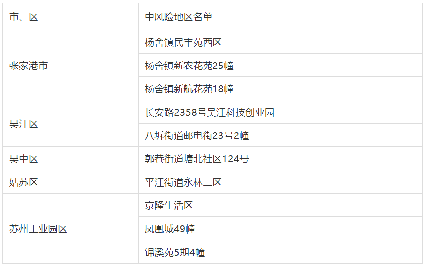 张家港市凤凰镇金谷小区18、19幢、张家港市杨舍镇君临新城6号楼、张家港市凤凰镇双龙花园62幢、张家港市杨舍镇金新城悦府7幢、吴江区江陵街道城南花苑2167幢、吴中区郭巷街道双湾花园35幢、吴中区郭巷街道国泰社区国泰一村105幢、相城区万宇名都花园5幢、姑苏区胥江路361号(东方苑)1幢、姑苏区平江街道凤池弄5-2号楼、苏州工业园区南山·丽舍40幢、苏州工业园区文华公寓4号楼、苏州工业园区绿地·华尔道名邸小区由中风险地区调整为低风险地区。