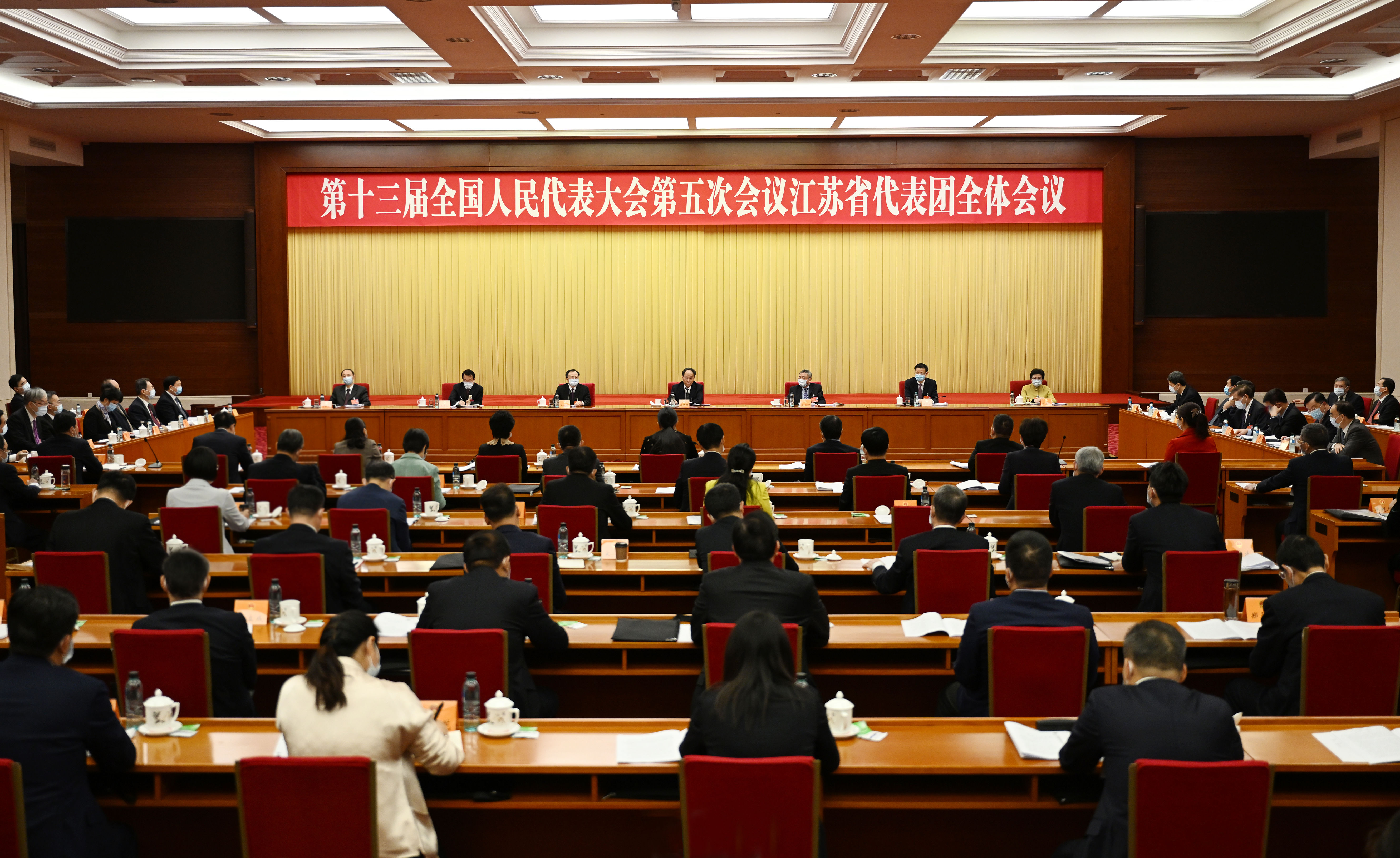 全国人大代表、省委书记、省人大常委会主任吴政隆今天下午在参加十三届全国人大五次会议江苏代表团审议政府工作报告时说,要坚持以习近平新时代中国特色社会主义思想为指导,弘扬伟大建党精神,坚决贯彻党中央决策部署,认真落实全国两会精神,坚持稳中求进工作总基调,把握新发展阶段,完整准确全面贯彻新发展理念,加快构建新发展格局,推动高质量发展,努力为稳定全国宏观经济大盘当好重要压舱石,在新时代新征程上坚决扛起“争当表率、争做示范、走在前列”光荣使命、奋力谱写“强富美高”新江苏现代化建设新篇章,以实际行动迎接党的二十大胜利召开。