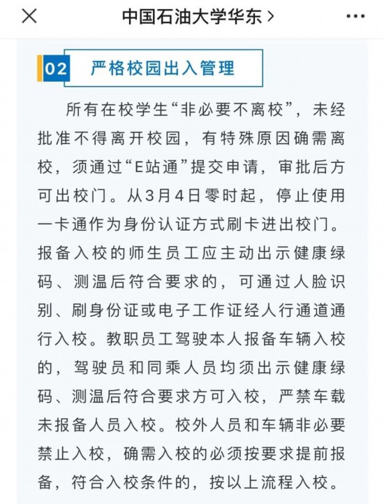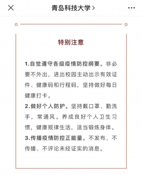 近日,中国石油大学(华东)、青岛科技大学、青岛黄海学院发布通知,提醒学生“非必要不离校”,严格校园出入管理,严格人员聚集管控。